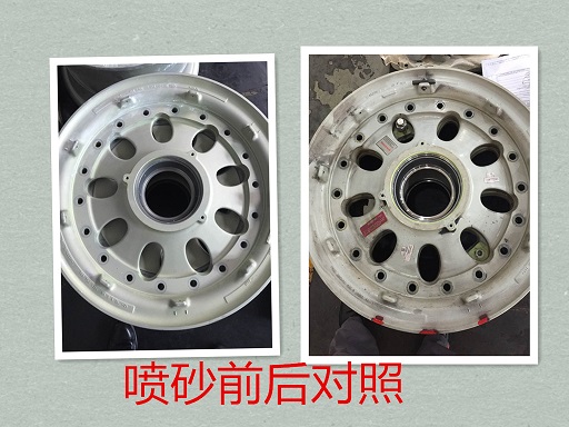 飛機輪轂退漆噴砂機工藝介紹 1、處理工件名稱:飛機輪轂 2、工件外形尺寸:適用任何飛機輪轂 3、噴砂部位:油漆部位 4、噴砂目的:清理油漆涂層,做探傷檢測后,再噴漆使用 5、噴砂壓力:5KG壓力 6、噴砂磨料:樹脂砂 8、上下件方式:人工、機械手